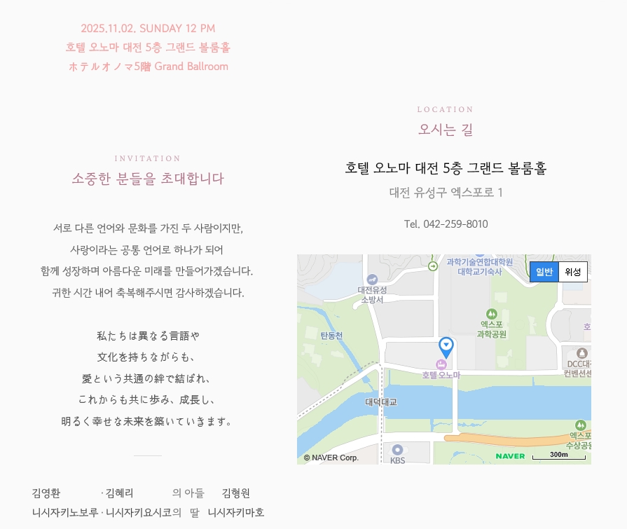 1. 일 시: 2025년 11월 2일(일), 오후 12시 3. 모바일 청첩장: https://theirmood.com/card/4pYQ4uJDgJ 4. 신랑 : 김형원 (혼주 : 김영환, 김혜리) 신부 : 니시자키마호 (혼주 : 니시자키노보루, 니시자키요시코) * 마음 주실 곳: 하나은행 679-910077-26607 / 김영환 / 010-****-5612